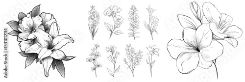 Fototapeta premium Contemporary outlines of blossoming plants, including rhododendron and lily, set against a white backdrop with a black hue