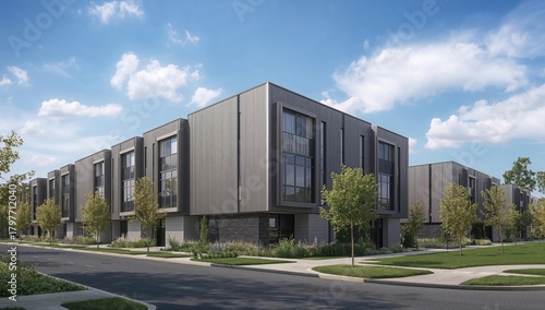 Fototapeta premium Contemporary residential structures, exterior view of energy-efficient homes, urban density