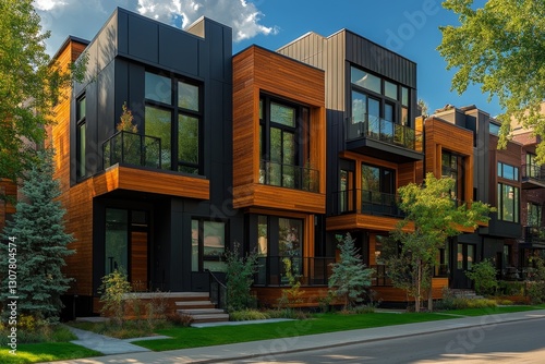 Naklejka premium Contemporary residential townhouses with black and wood facades bring a touch of modern style to urban living, offering comfort and sophistication