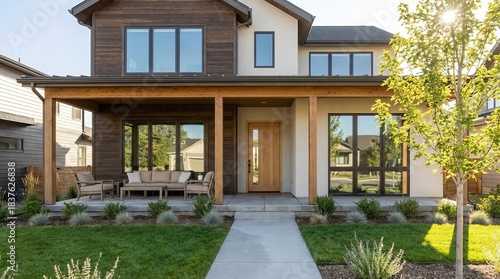 © StocksJust4You, Obraz premium Contemporary suburban home exterior, featuring a spacious yard, clean lines, and a welcoming covered porch, creating a fresh, modern residential atmosphere