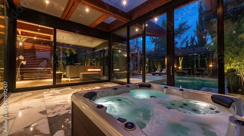 Fototapeta premium Contemporary sunroom with a sleek hot tub, ambient lighting, and a night sky...