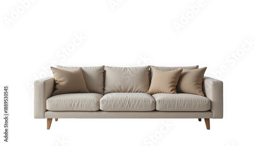 © MUSSAB, Fototapeta premium Contemporary three-seater fabric sofa featuring neutral beige upholstery and comfortable matching throw pillows on transparent background