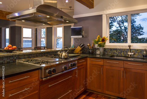 © ML Harris, Fototapeta premium Contemporary upscale home kitchen interior with wood cabinets, gas stove, stainless steel vent hood, concrete countertops, glass tile backsplash, flat screen television and view windows