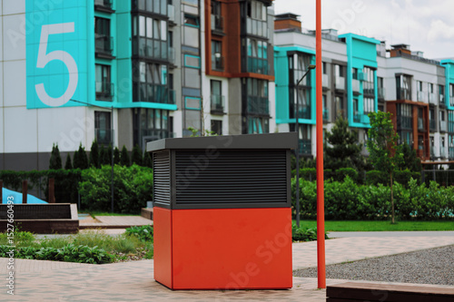 Naklejka premium contemporary urban kiosk with colorful backdrop features modern architecture and a vibrant geometric design, set against residential buildings, lush greenery, bright colors, and a large number 5