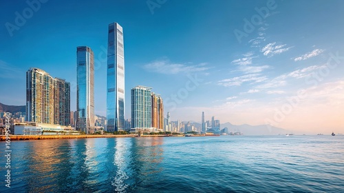 Naklejka premium Contemporary Urban Landscape: Blue-Glass Skyscrapers Reflected on Calm Waters...