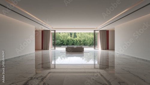 Naklejka premium Contemporary villa interior featuring a wide living space with extensive window views, ideal for layout design