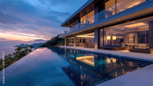 Obraz premium contemporary villa with sleek architecture, an infinity pool, and panoramic...
