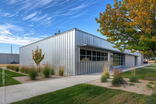 Obraz premium contemporary warehouse exterior featuring streamlined design with integrated...