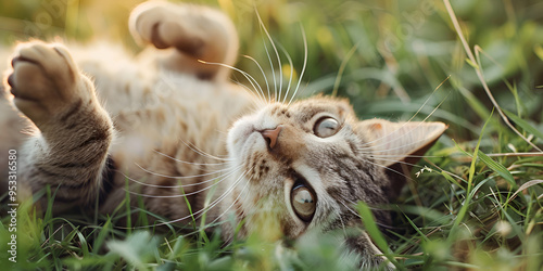 © Professional, Obraz premium Content Cat Rolling Playfully in Lush Grass