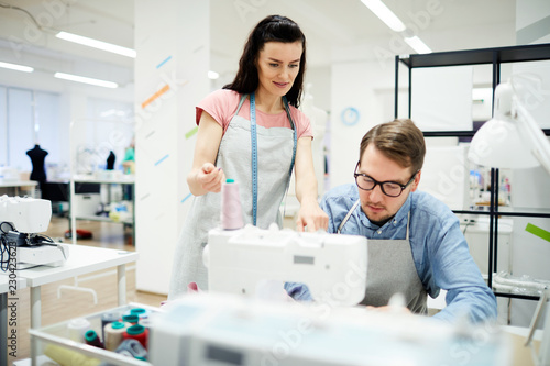 © pressmaster, Obraz premium Content confident attractive young woman in apron standing at interns workplace and explaining student how to work on sewing machine in workshop