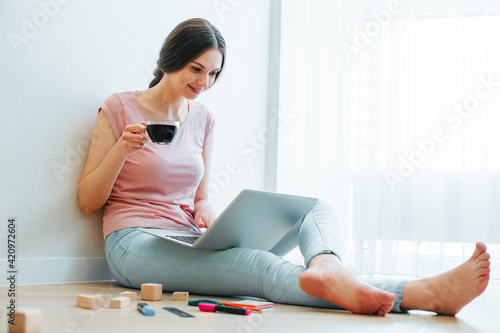 Obraz premium Contented smiling young female working on the laptop