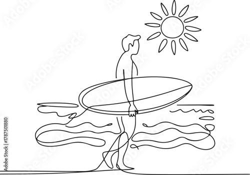 © rs_studios, Fototapeta premium Continuous Line Art Illustration of Surfer Holding Board with Waves and Sun