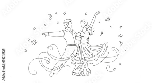 © Lua, Obraz premium Continuous line drawing of a dancing couple surrounded by musical notes and swirling lines design art