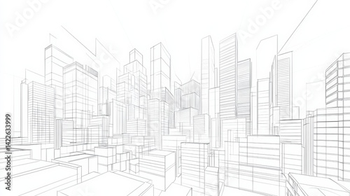 © kkkiim graphic, Fototapeta premium Continuous line drawing of modern urban architecture with apartment buildings and panoramic cityscape. Minimalist linear vector design of contemporary city street silhouette and skyline view.