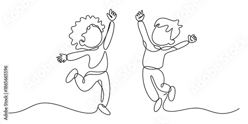 © Bobita, Fototapeta premium Continuous line drawing of two happy children jumping in a playful and joyful pose Vector, illustration