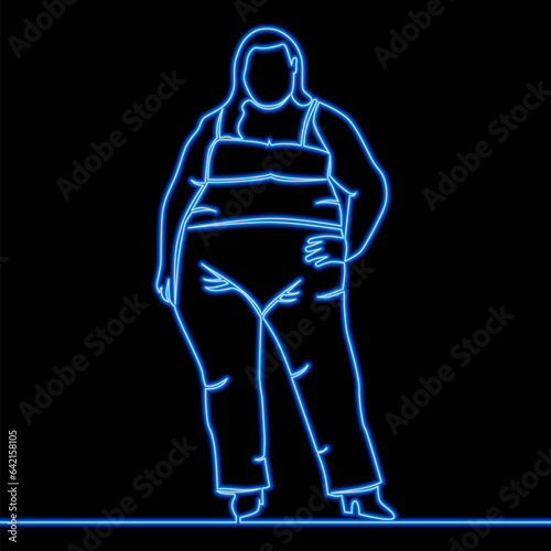 © tiverets, Naklejka premium Continuous line drawing Oversize obesity large lady Body positive woman icon neon glow vector illustration concept