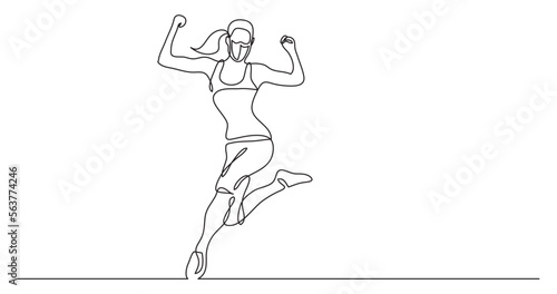 Fototapeta premium continuous line drawing vector illustration with FULLY EDITABLE STROKE - happy running athlete woman wearing face mask