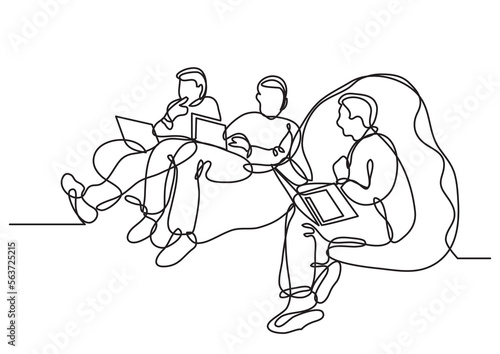 © OneLineStock, Fototapeta premium continuous line drawing vector illustration with FULLY EDITABLE STROKE of programmers with laptops on bean bags