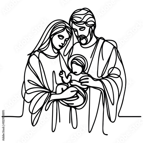 Fototapeta premium Continuous one line Christmas vector Christian nativity scene of baby Jesus with Mary and Joseph. Bethlehem scene.