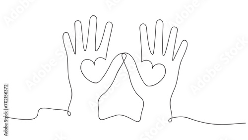 Fototapeta premium Continuous one line drawing. Abstract hands holding hearts. Vector illustration