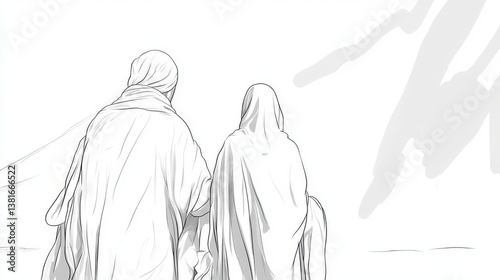 © Aysel, Obraz premium Continuous one line drawing muslim couples wife and husband wearing white traditional clothes for Ihram ready for Hajj. Hajj and umrah concept. Single line draw design vector graphic illustration.