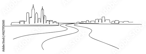 © Wieslaw, Fototapeta premium continuous one line drawing of a road leading to a city skyline urban landscape vector outline sketch