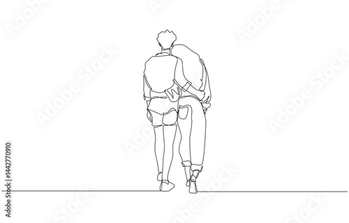 © Yossakorn, Obraz premium Continuous one line drawing of couple hugging while walking, romantic couple concept, single line art
