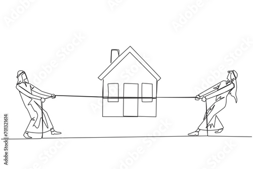 © Simple Line, Obraz premium Continuous one line drawing two Arabian businessmen fight over a miniature house. The struggle to achieve dream home. Investment that won't make a loss. Single line draw design vector illustration