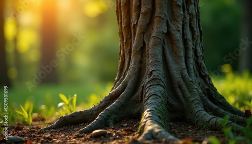 © jiratip, Obraz premium Contorted pine trunk, deep furrows, sunlit bark, close-up, bent