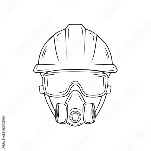 © Nikita, Naklejka premium Contour illustration of a hardhat, safety goggles, and gas mask. Black and white construction worker PPE.