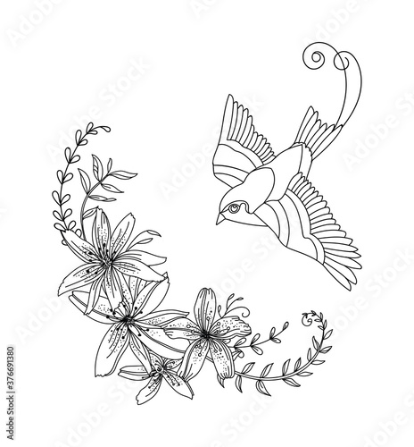 © alinart, Obraz premium Contour vector flying bird with flowers composition