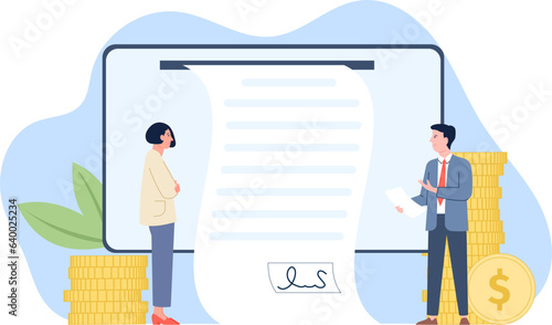 Fototapeta premium Contract signing with professional worker. Business deal, taxes or digital agreement for job. Flat vector corporate concept