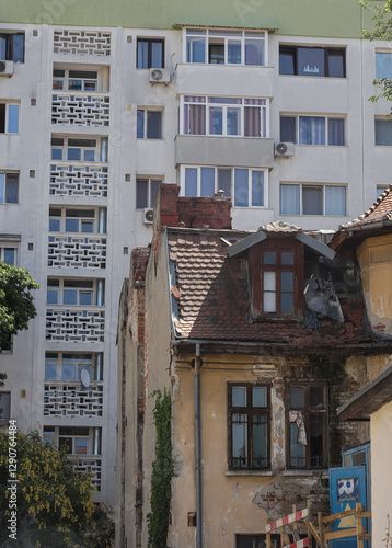 © Oleh Marchak, Naklejka premium Contrast between historical architecture and modern buildings in Bucharest Romania highlights urban development struggles