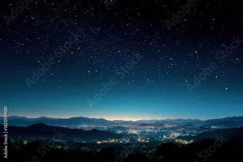 © mat, Fototapeta premium Contrast between starlit rural area and bright cityscape showing light pollution boundary with copy space. Soft night light. Horizon background.