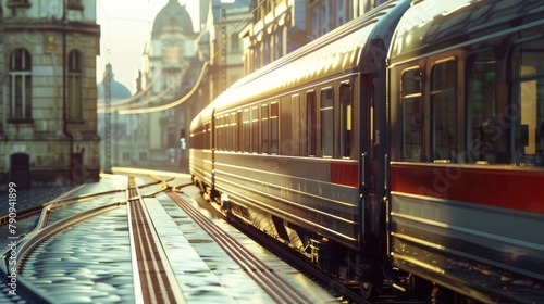 © Jeerawut, Fototapeta premium contrast between the sleek, modern train and the historic architecture of the city as it passes through a mix of old and new.