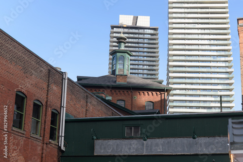 Obraz premium contrast of architecture at Gooderham & Worts Limited distillery, or the...