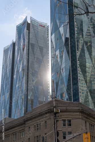 © eugen, Naklejka premium contrast of Dominion Public Building (1 Front St) and CIBC Square, North and South Towers (141 Bay St), Toronto