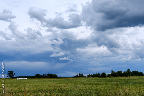 © Martins Vanags, Obraz premium contrast rain storm clouds over green meadow and some trees in summer