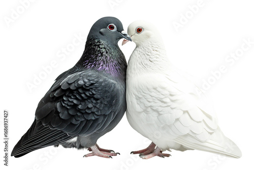 © Boltan Pic Studio, Fototapeta premium Contrasting black and white Jacobin pigeons together isolated on transparent background