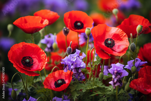 © robi, Obraz premium Contrasting bright red poppies cover half of the frame