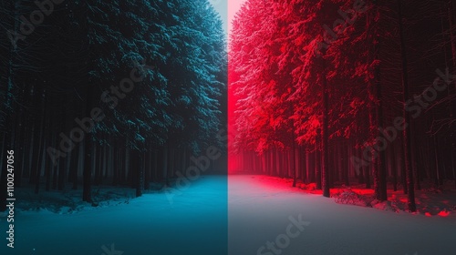 Obraz premium Contrasting forests a mystical encounter at twilight nature scene surreal atmosphere split view duality concept