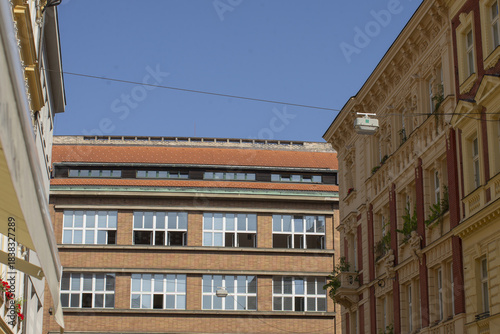 Obraz premium contrasting modern and historic facades with brick office block facing ornate...