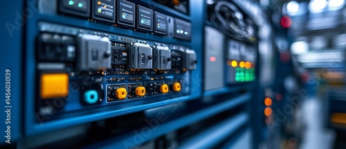 Fototapeta premium Control panel stands prominently showing numerous electronic components, connectors, and displays reflecting precision engineering.