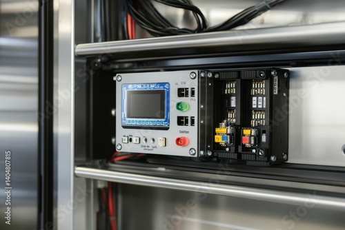Obraz premium Control panel with digital display and circuit breakers in a cabinet