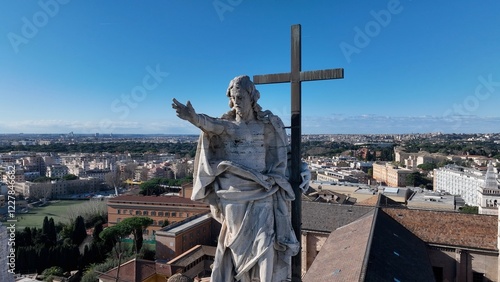 © ItalyDrones, Fototapeta premium Controluce sulla basilica di San Giovanni in Laterano a Roma Vista aerea della facciata e delle statue sul tetto della basilica