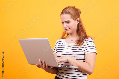 Naklejka premium Conused girl with laptop on his hand in studio