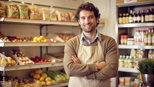 Fototapeta premium Convenient Store Supermarket Worker Smiling with Arms Crossed
