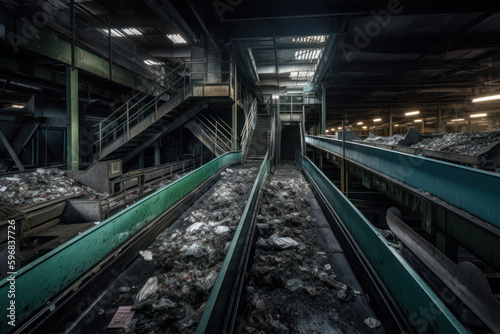 Obraz premium Conveyor Belt at Recycling Plant Transporting Garbage for Processing