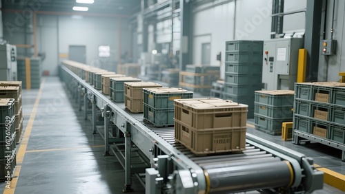 Naklejka premium Conveyor Belt Transporting Crates in a Factory