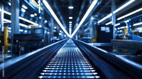 © Formoney, Fototapeta premium Conveyor belts extend into the distance within a spacious manufacturing facility. Bright overhead lights illuminate the workspace, highlighting the efficient production environment